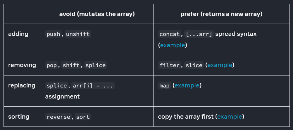 - 배열 내부의 항목을 재할당해서는 안되며 push, pop 같은 배열을 변경하는 메서드를 사용하면 안된다.