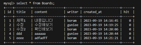 UPDATE Boards SET title='수정', content='수정해보기' WHERE id=2;