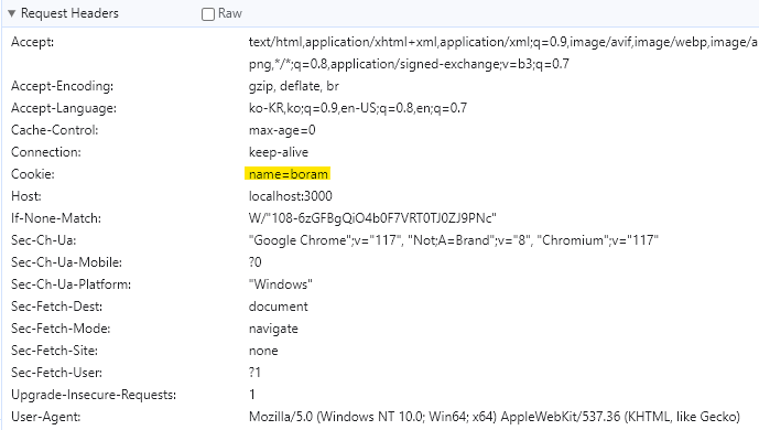 - 쿠키는 요청메세지를 만들어 요청헤더에 나임을 식별하게 알려준다.